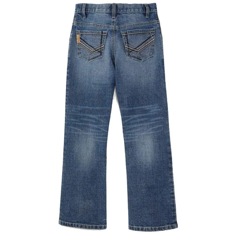 Constructed in a performance stretch denim, this relaxed fit boy’s jean features a classic rinse finish complemented by tint, hand sanding, whiskers and chevrons. Cream and amber embroidered back pockets, along with copper hardware deliver a jean with continuous style.