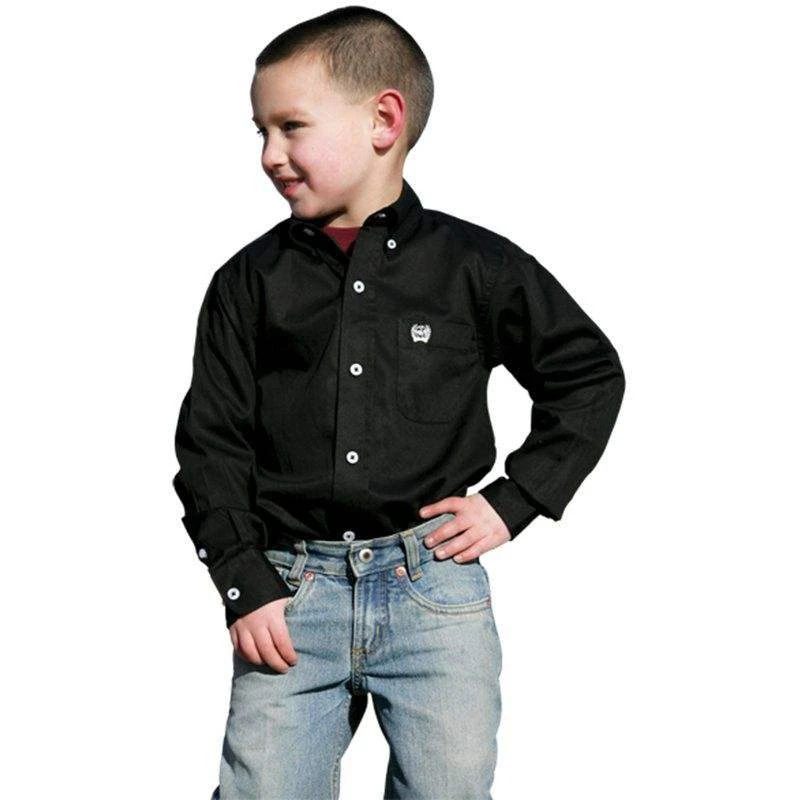 logo on it. This boy’s shirt has long sleeves with adjustable cuffs to allow them to roll the sleeves up or keep them down. This shirt is made of 100% cotton fabric so that it is easy to take care of. The back has a straight back yoke with a box pleat. This solid black Cinch shirt has white buttons that really pop off the solid black of the shirt and match the white Cinch logo. All boys like the color black, so this shirt is a must have for your little cowboy! This shirt is a solid color so it was go great with any pair of Cinch blue jeans. It is always good to have a solid black shirt in the closet for certain events where they need to look sharp!
