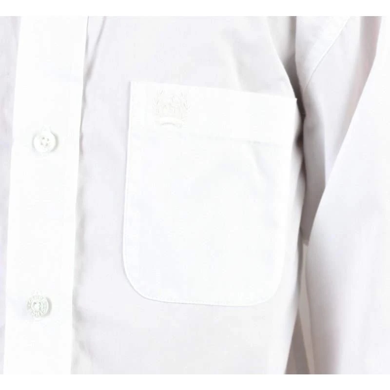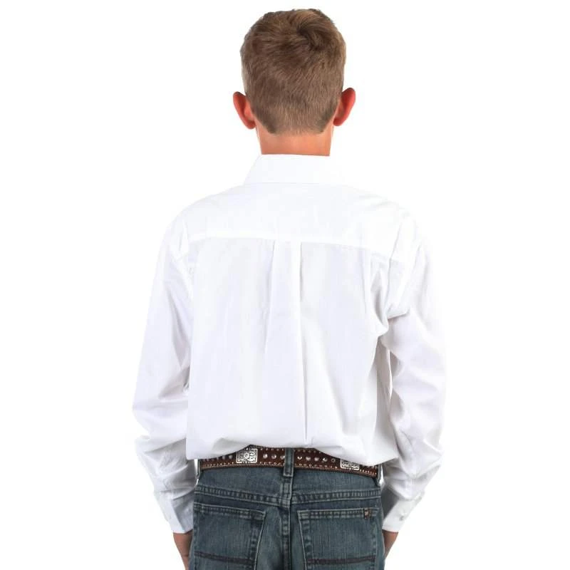 This boy’s shirt by Cinch is a long sleeve button down western shirt that is a solid white. This shirt has a button down collar, so that you can secure a tie if you are dressing your little guy up for a special occasion. There is one chest pocket on the front that has a white embroidered