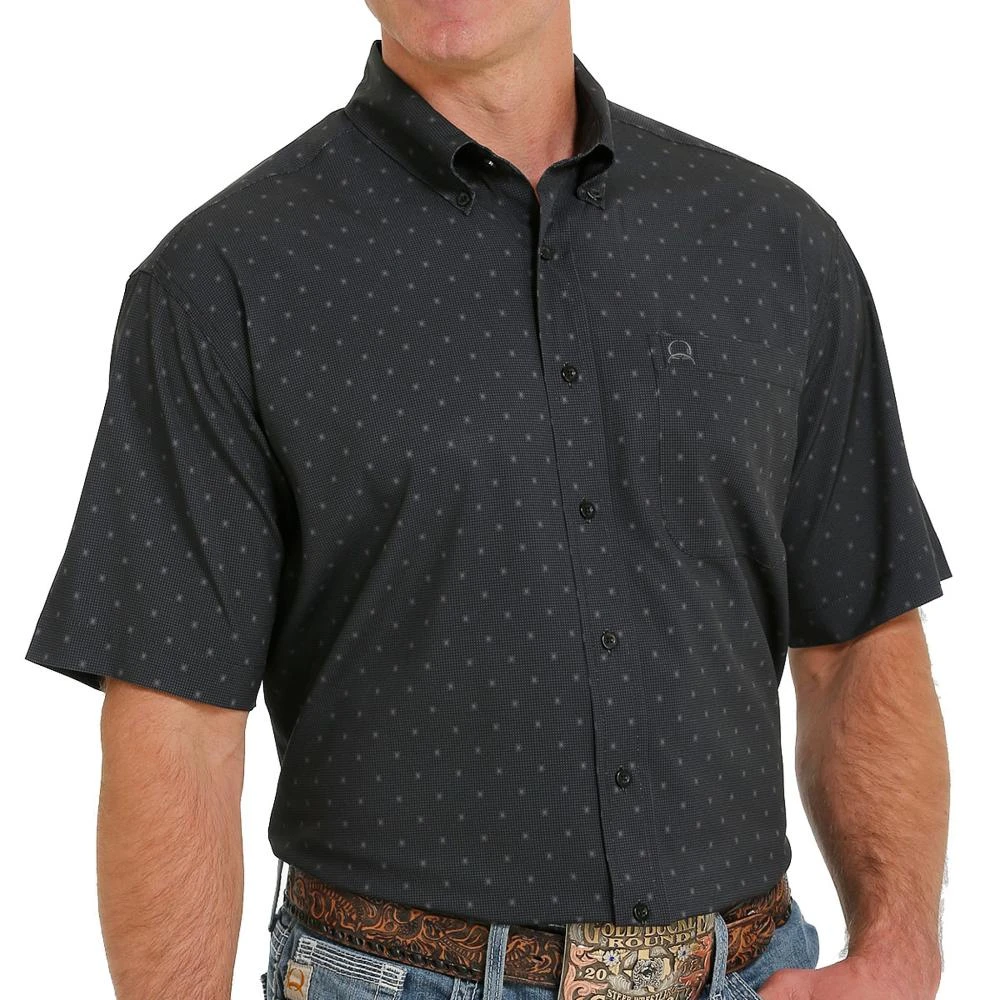 This black printed Arenaflex shirt by CINCH wears easily for everything from a relaxed Friday at the office to an afternoon at the ranch. Lightweight poly-spandex construction features an open left front pocket, embroidered logo and black buttons.
