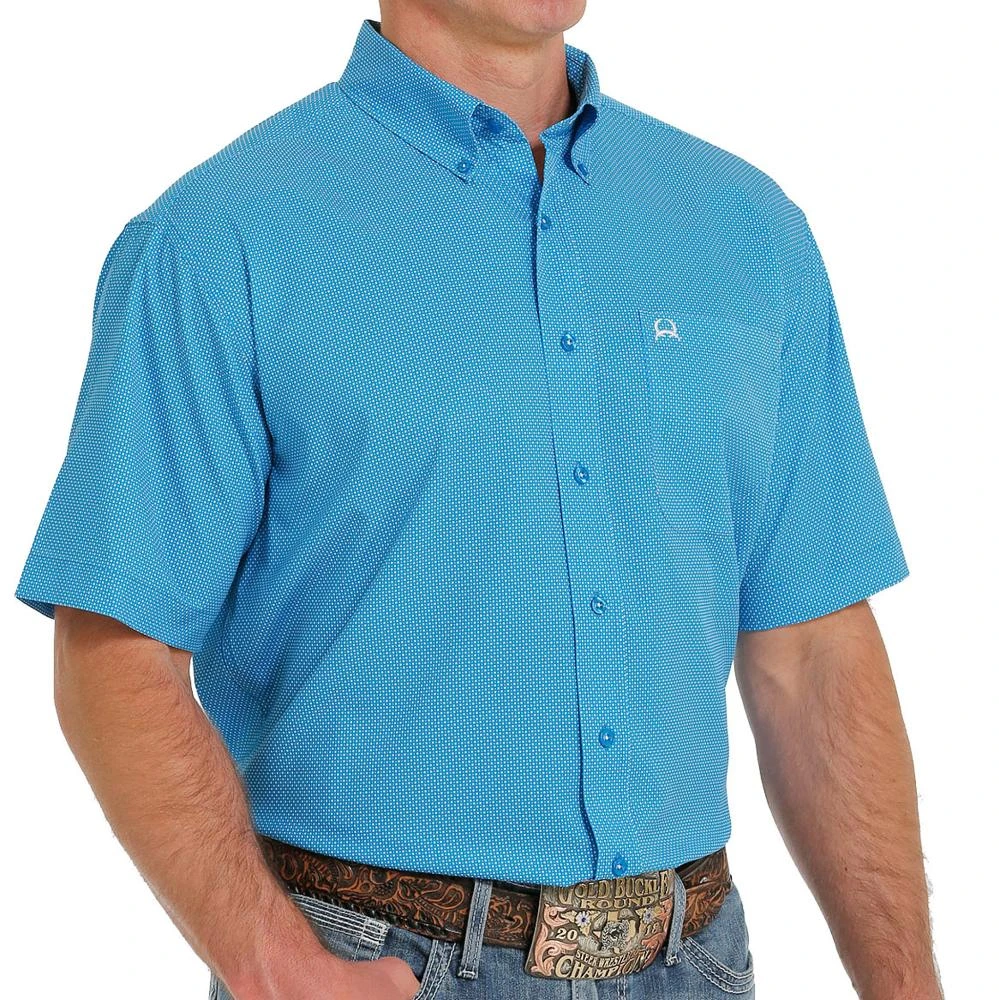 This blue printed Arenaflex shirt by CINCH wears easily for everything from a relaxed Friday at the office to an afternoon at the ranch. Lightweight poly-spandex construction features an open left front pocket, embroidered logo and blue buttons.