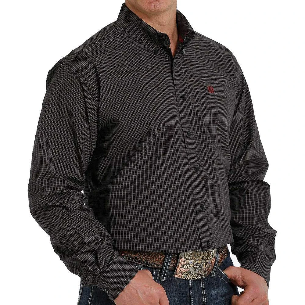 Turn heads wearing a black geometric printed cotton plain weave engineered by CINCH. This good-looking shirt features classic construction with an open left front pocket, embroidered logo and black buttons.