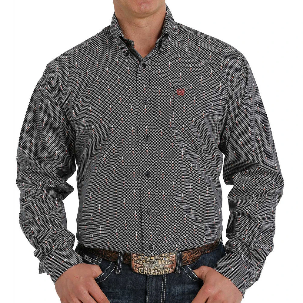 Turn heads wearing a black and white geometric printed cotton plain weave engineered by CINCH. This good-looking shirt features classic construction with an open left front pocket, embroidered logo and white buttons.