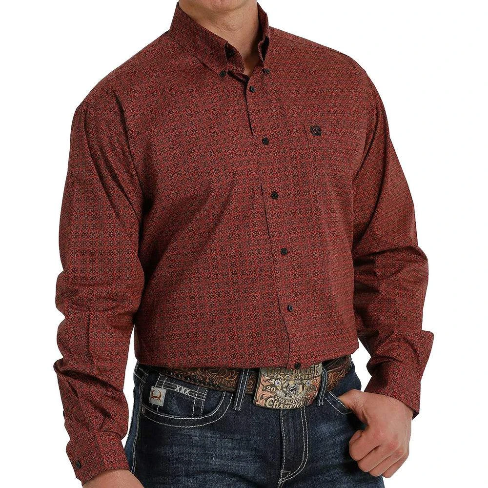 When comfort is key, opt for a printed cotton-spandex plain weave like this one engineered by CINCH. Extra stretch provides day-long wearability, with design details including an open left front pocket, embroidered logo and black buttons.