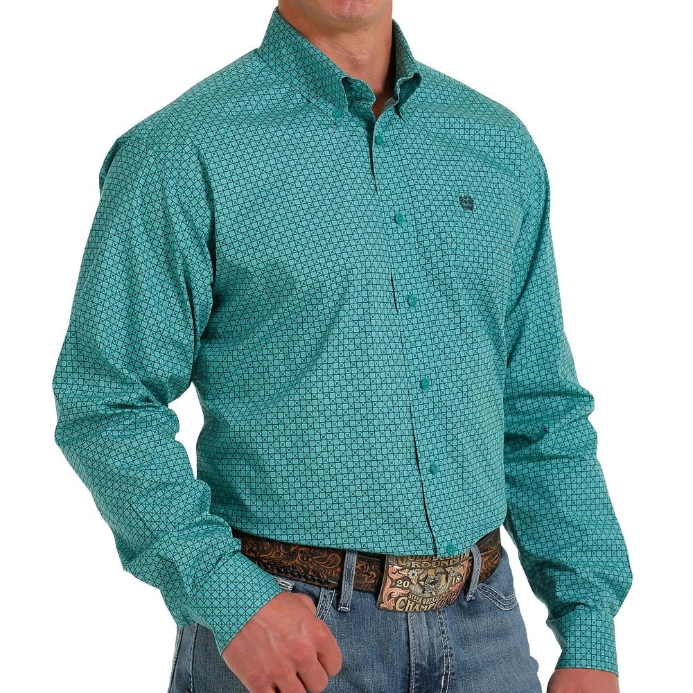 An allover geometric print and classic design details make this handsome shirt a must-have for any occasion. Featuring an open left front pocket, embroidered CINCH logo and teal buttons, our all-season option will highlight any favorite blue jeans and boots.