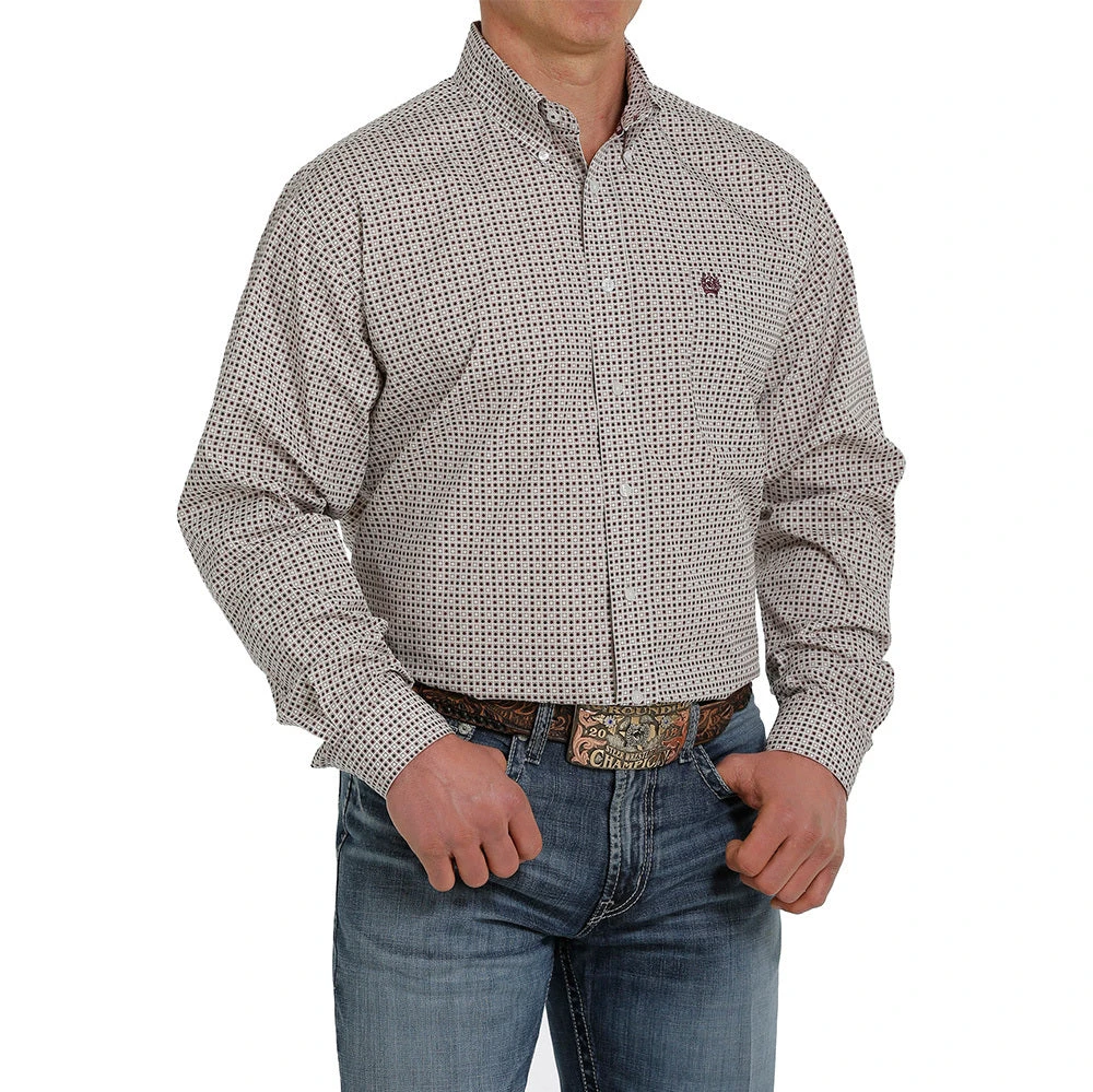 Β Step out in style wearing our khaki and purple printed long sleeve buttondown by Cinch.