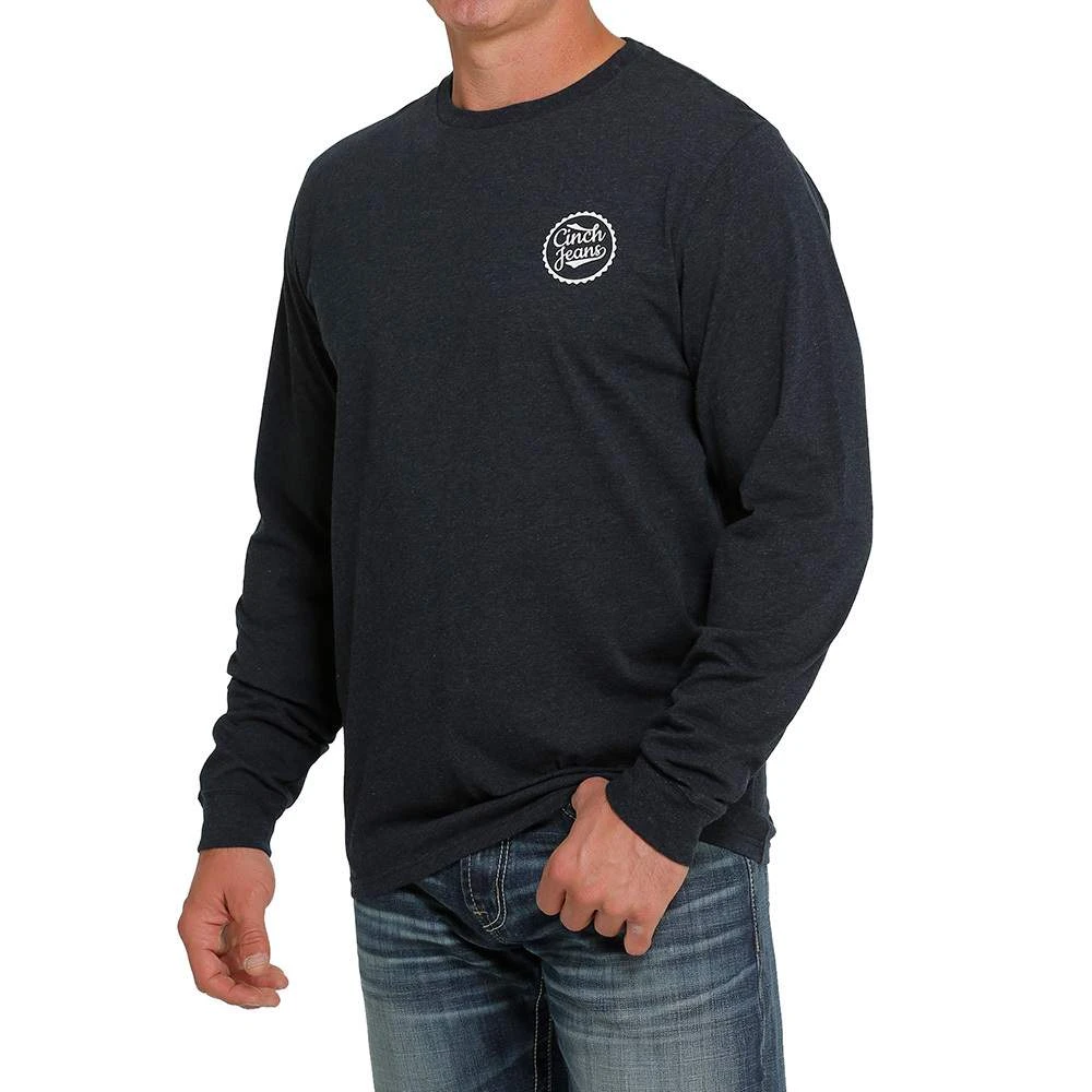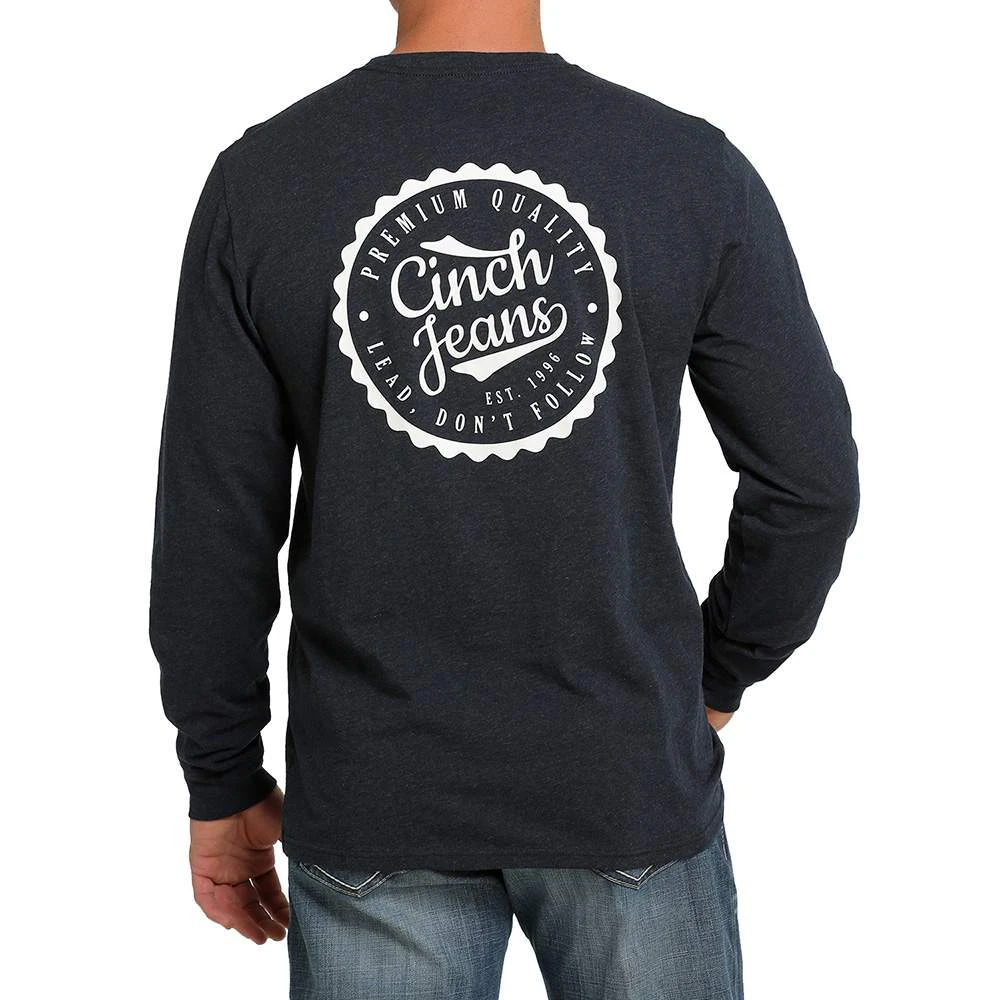 Ā Heathered navy cotton-poly jersey tee with royal and white front screen print.