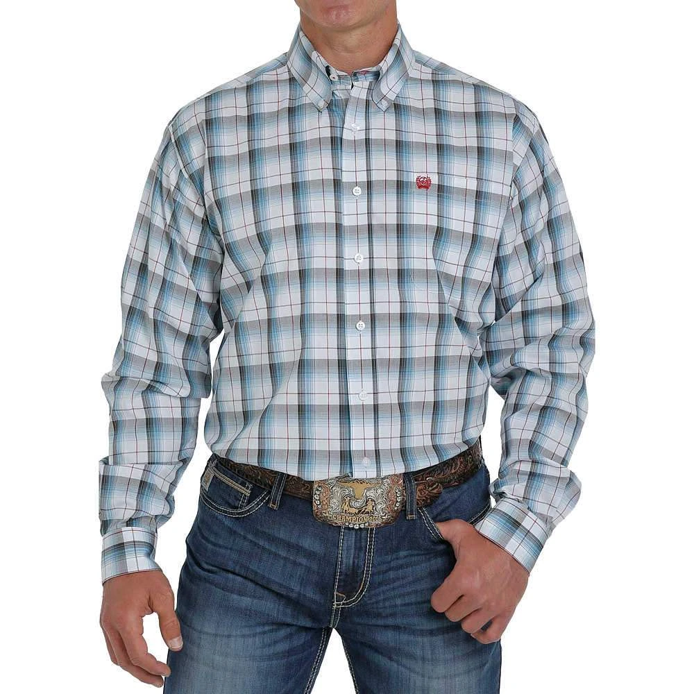 Β On or off the range, experience the ultimate in comfort, style and wearability with a classic light blue plaid shirt by CINCH. Designed to stretch with you, this cotton-spandex plain weave features a left front pocket with logo embroidery and white buttons.