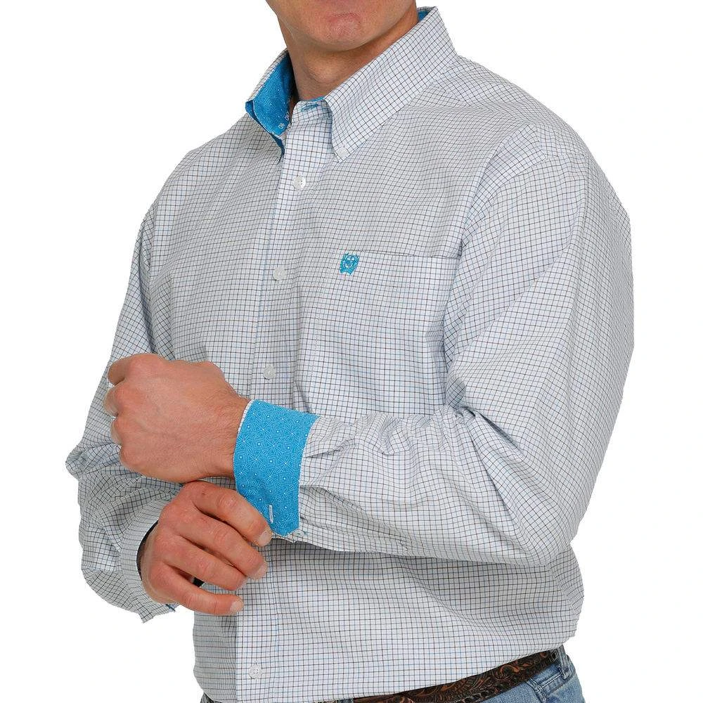 We’ve updated the classic white tattersall plaid button down with a trendy geometric printed contrast trim. Comfortable cotton plain weave construction features an open left front pocket, embroidered logo and white buttons.