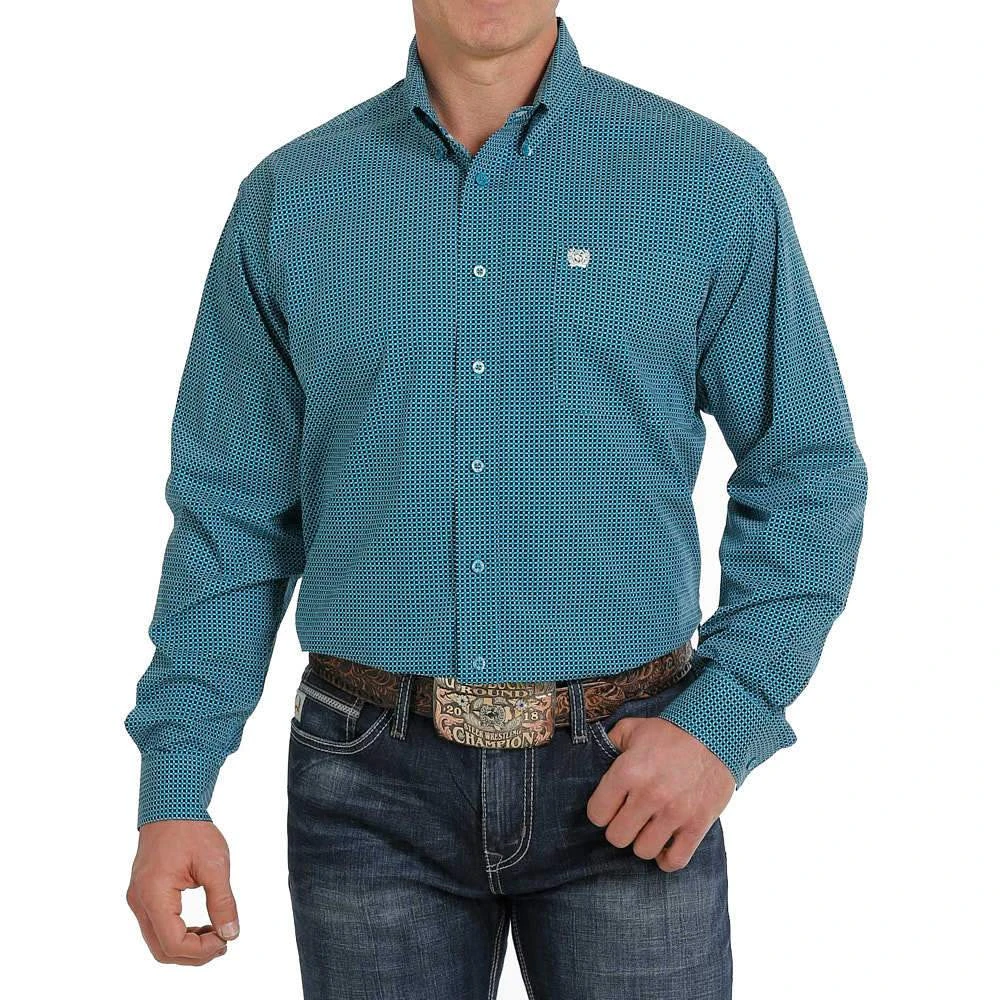 Add some style to your wardrobe wearing our teal & black print buttondown by Cinch.