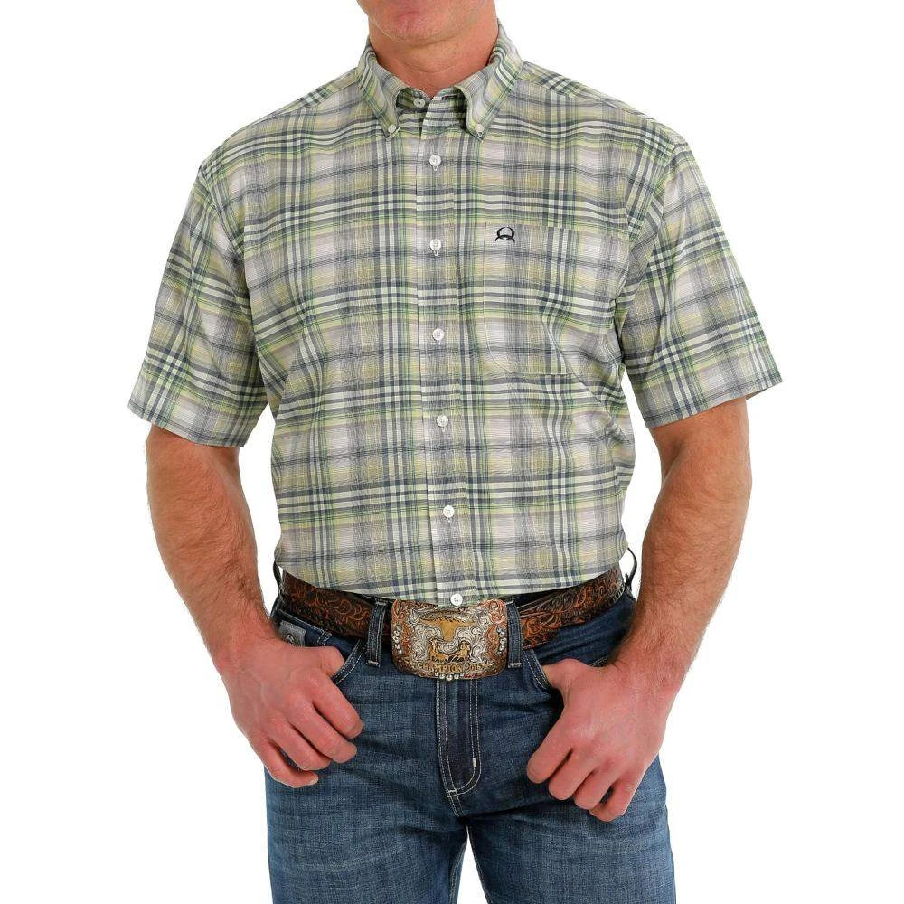 This green plaid Arenaflex shirt by CINCH wears easily for everything from a relaxed Friday at the office to an afternoon at the ranch. Lightweight poly-spandex construction features an open left front pocket, embroidered logo and white buttons.