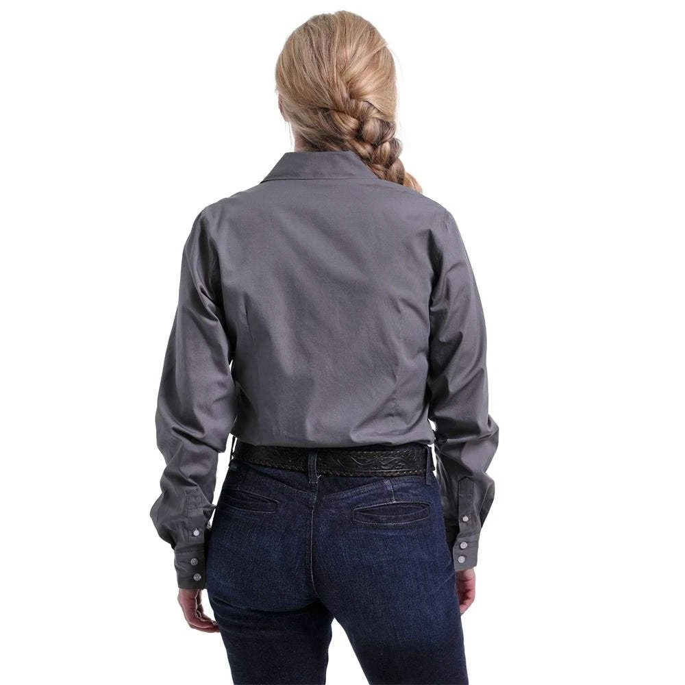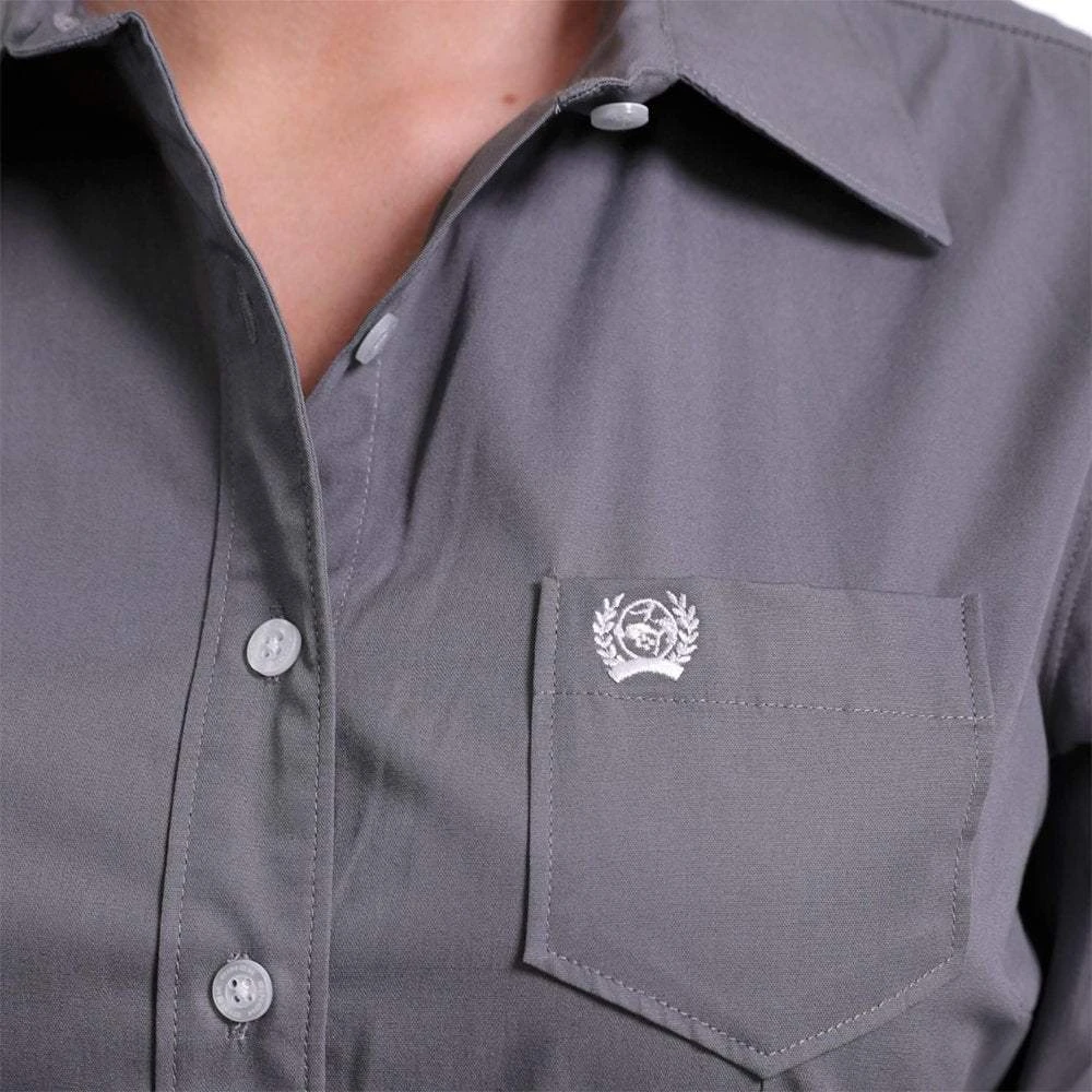 Β This Cinch women’s button-up shirt is made with a solid cotton plain weave, has white logo buttons and a necktape making it a classy shirt for the arena!