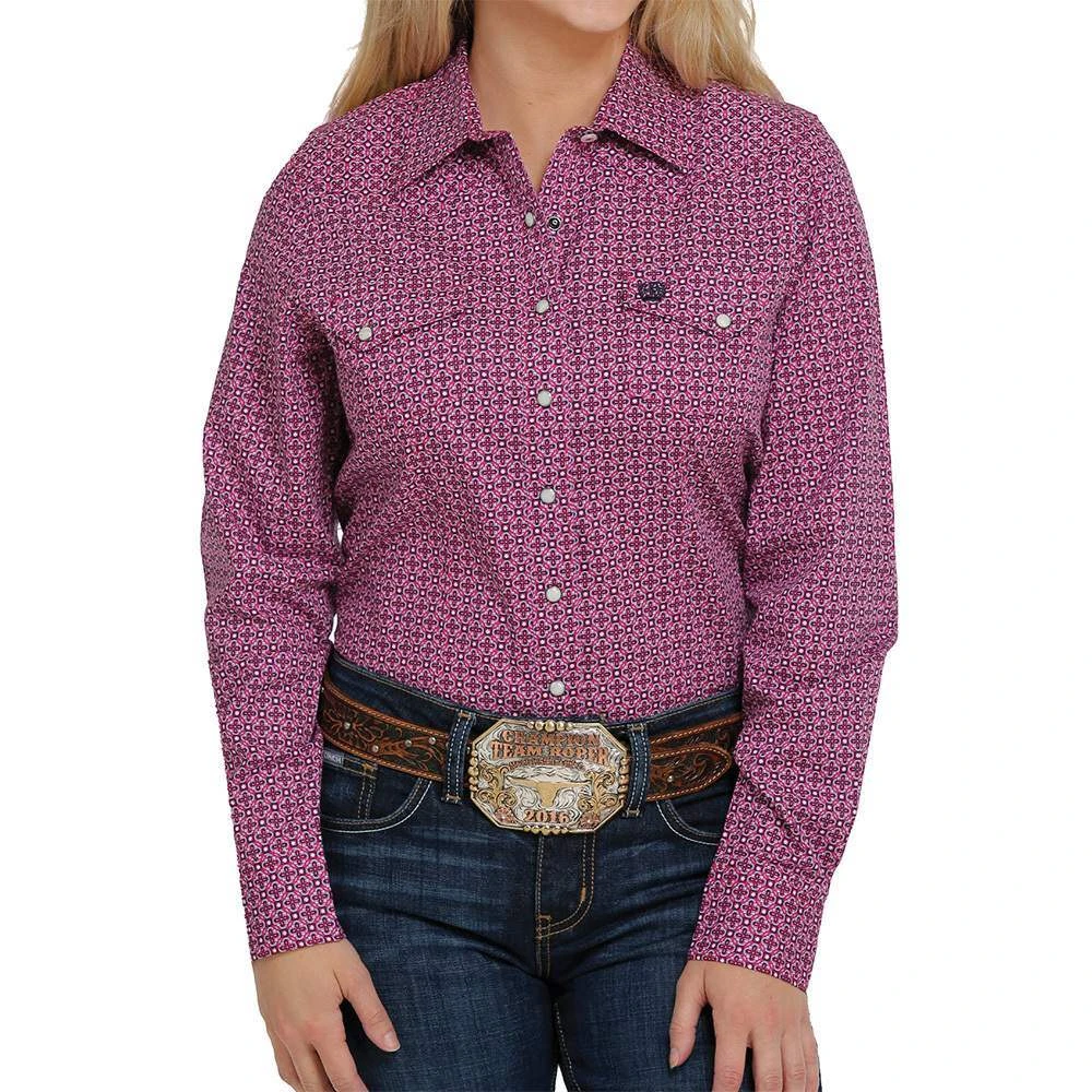 When the Western look is your favorite go-to style, choose a pink printed cotton plain weave like this one crafted by CINCH. The ideal match for new blue jeans and boots, this shirt features a spread collar, double front pockets, embroidered logo and white marble pearl snaps.